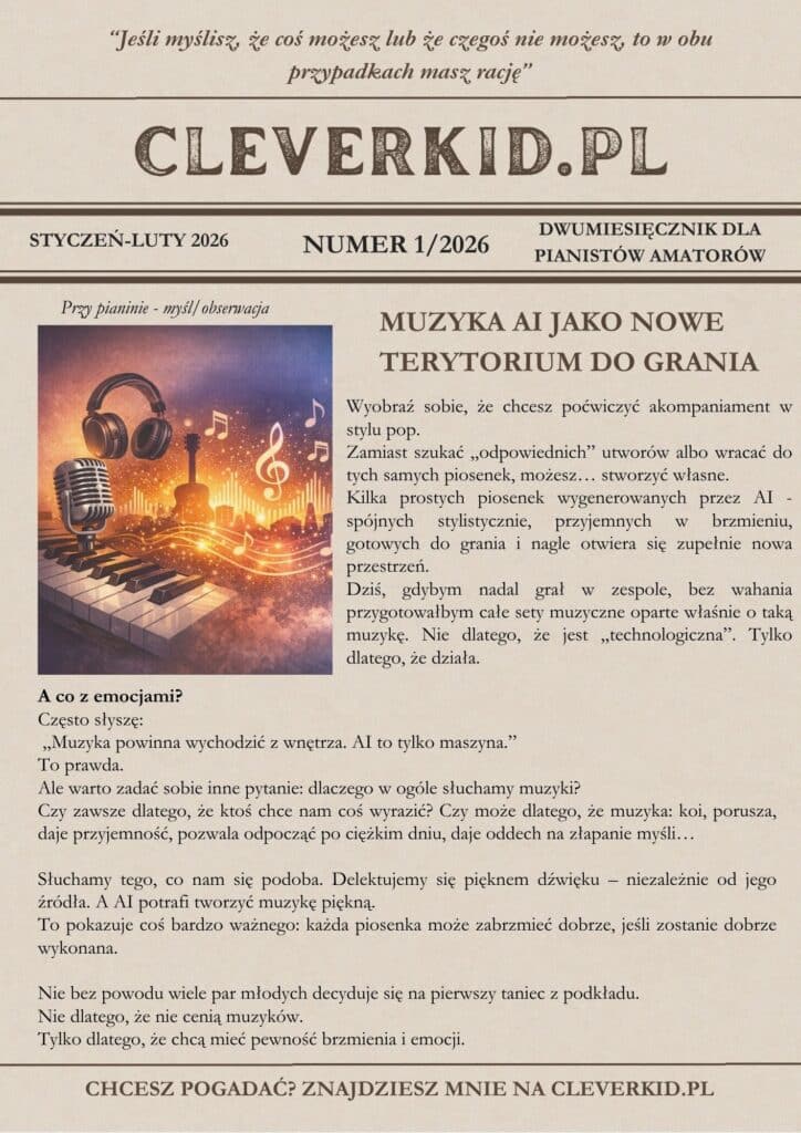 Gazetka Cleverkid to dwumiesięcznik dla dorosłych, którzy grają na pianinie –bez presji, bez ocen, z uważnością na proces i przyjemność grania. To opowieści o waszych sukcesach, rozsterkach, wyzwaniach, problemach … czyli o tym jak być blisko, cieszyć się muzyką i czerpać radość z grania nawet jeśli nie jesteśmy idealni…bo tak naprawde wcale nie chcemy tacy być. Dołaczasz?
