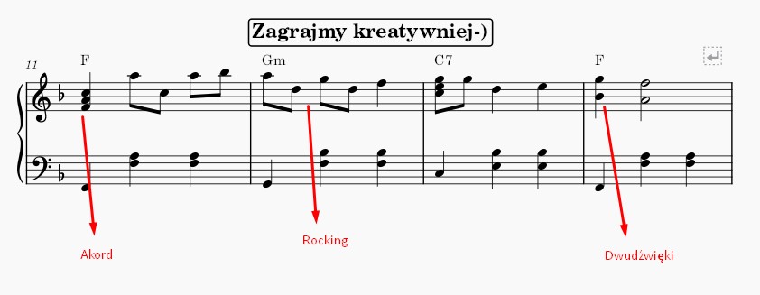 Dwudźwięki – wzbogacają linię melodyczną, dodając jej blasku. Zdarzyło ci się zachwycić dwudźwiękiem? Ja tak często miewam późnym wieczorem po pracy, gdy jestem już zmęczony i tak po ludzku potrzebuje trochę relaksu i odprężenia. Tak pianino to wspaniały terapeuta. Dlatego traktuj nuty na pianinie jako punkt wyjścia do stworzenia twojej własnej wersji a nie jako przystanek końcowy.
