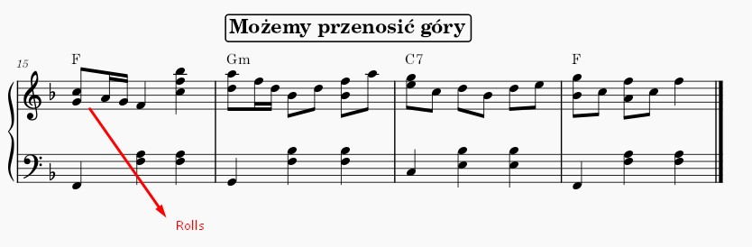 Po piąte, możemy dodać Rollsy. To jest typowa technika stride, którą płynnie opanujesz w module Stride naszej Akademii Pianina.